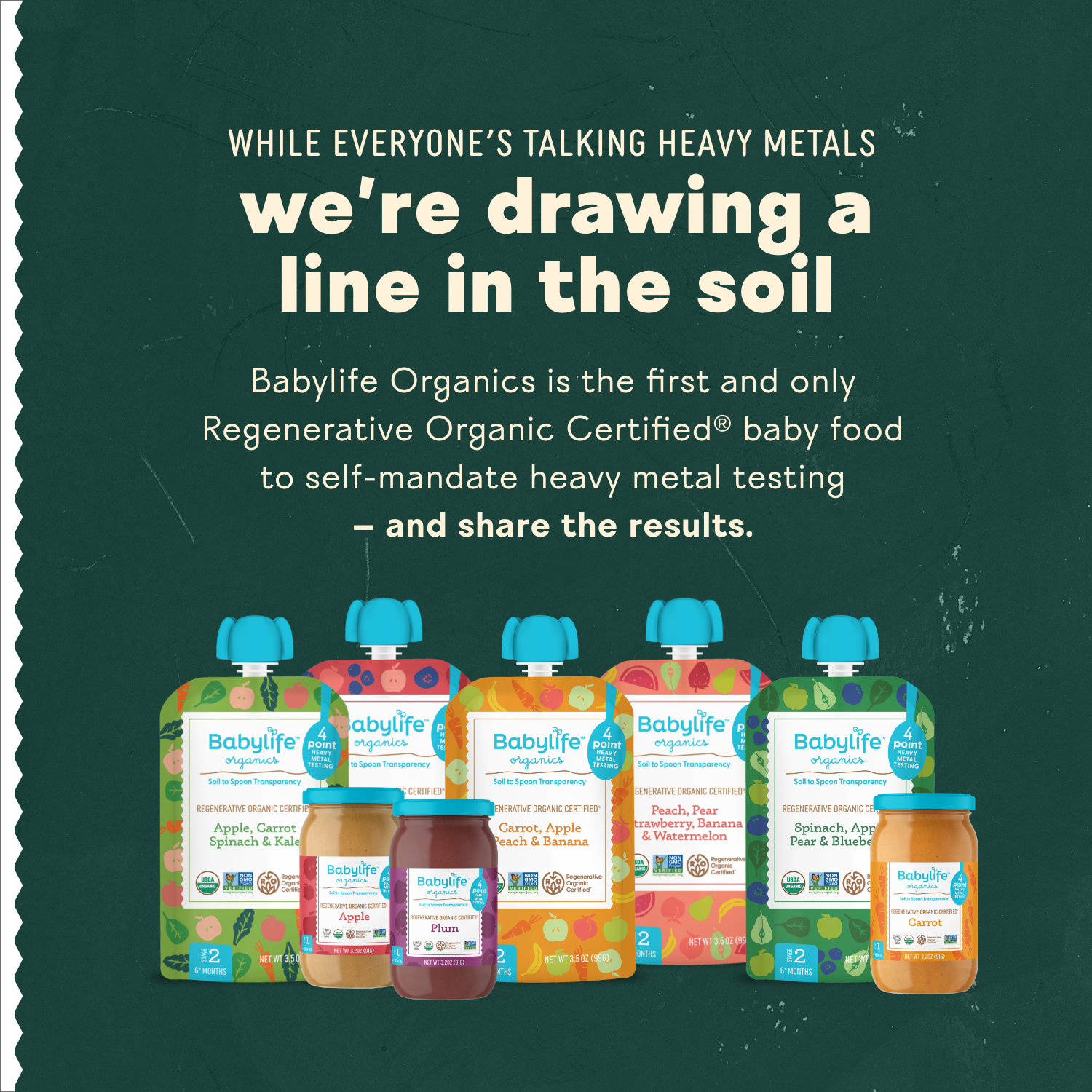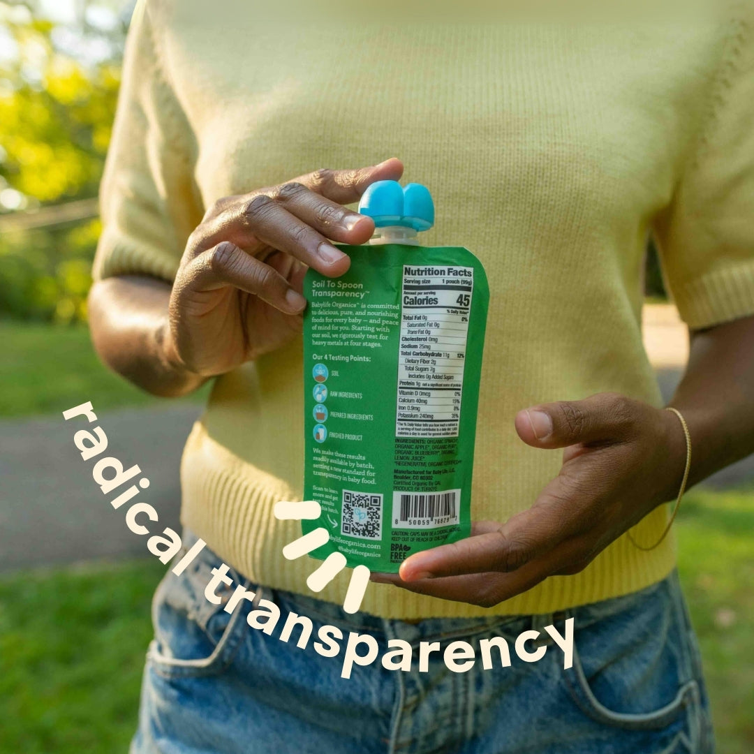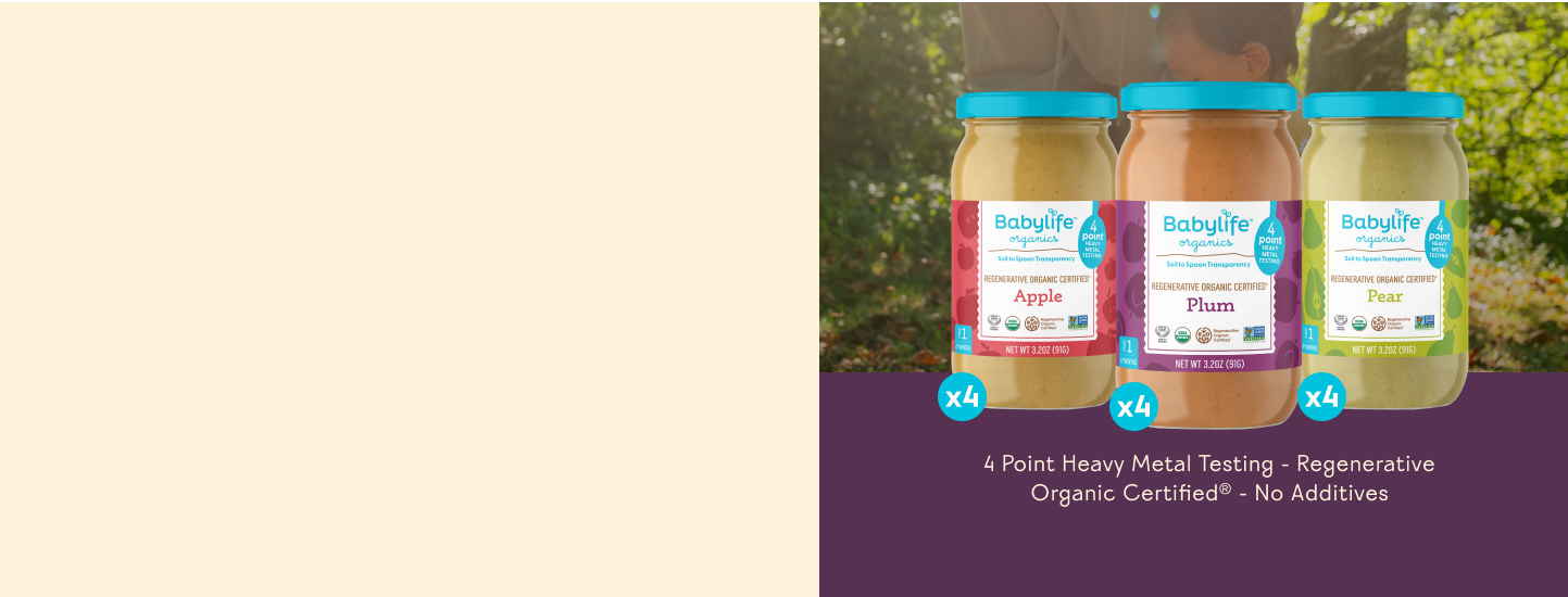 We are the only baby food brand to independently test every batch for heavy metal safety at four stages of production — soil, raw ingredients, prepared ingredients, finished product –and to publish the finished goods results (not just benchmarks) for any consumer or parent to review. We are also the first baby food brand to offer purées made with Regenerative Organic Certified® ingredients.