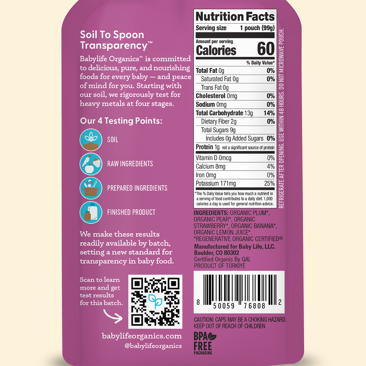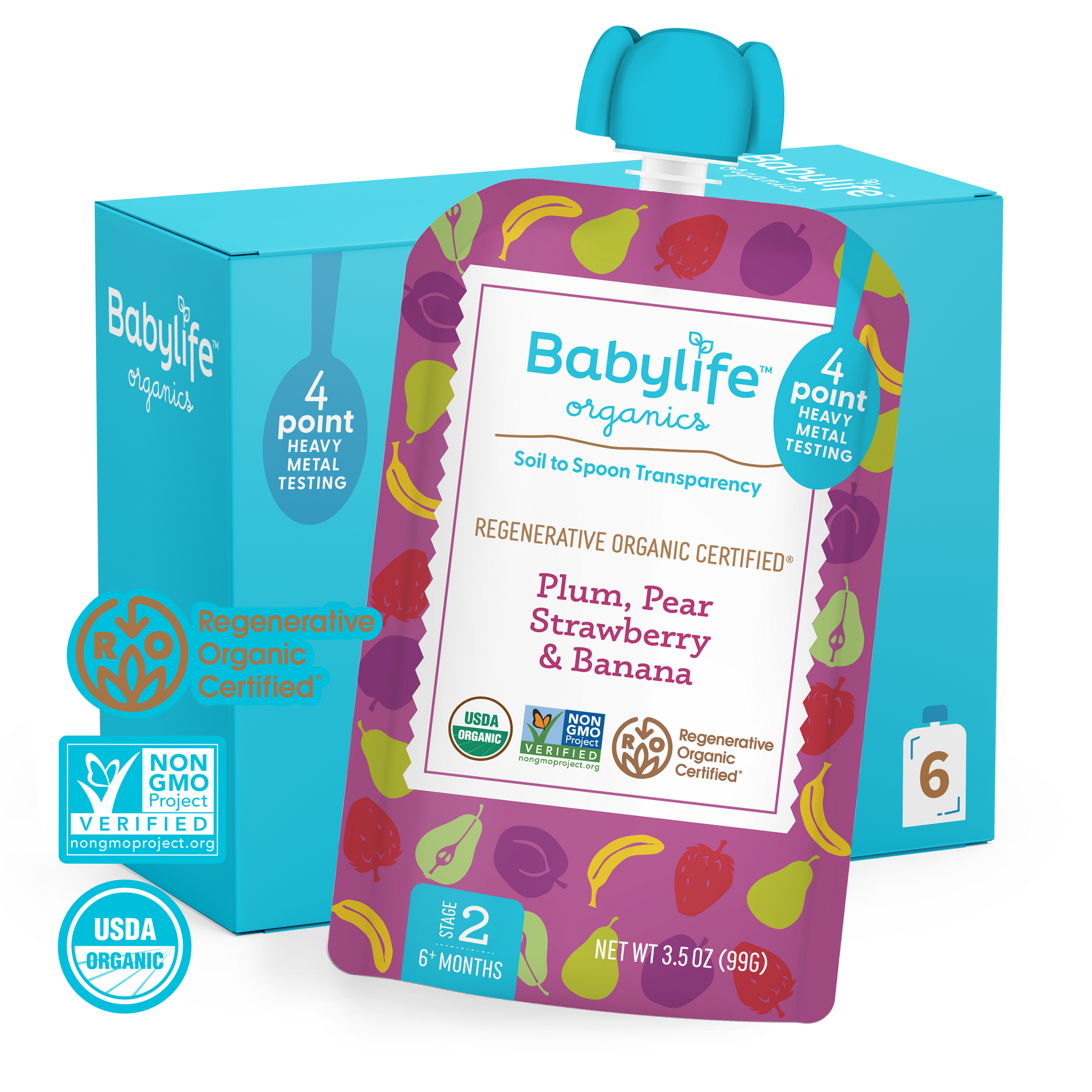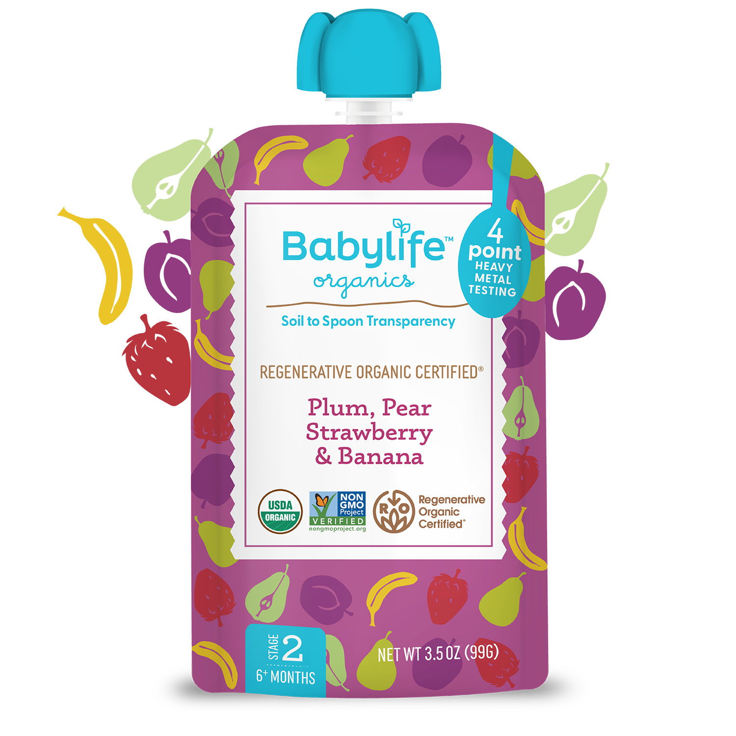 This is our unwavering commitment to safer, purer food for your baby. Soil to Spoon Transparency™ is a first-of-its-kind guarantee that includes Regenerative Organic Certified® farming and 4-point heavy metal testing with highly transparent results.