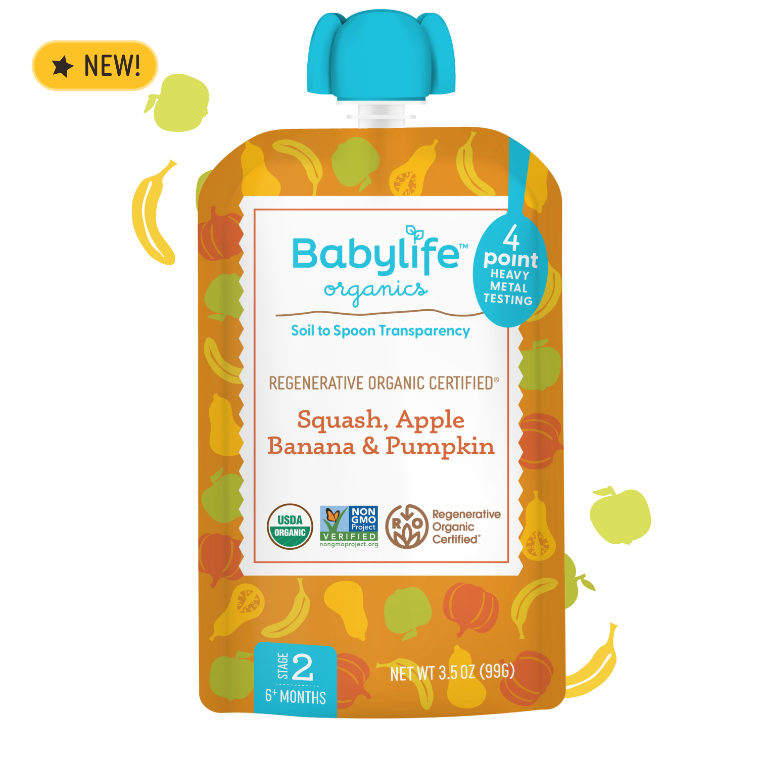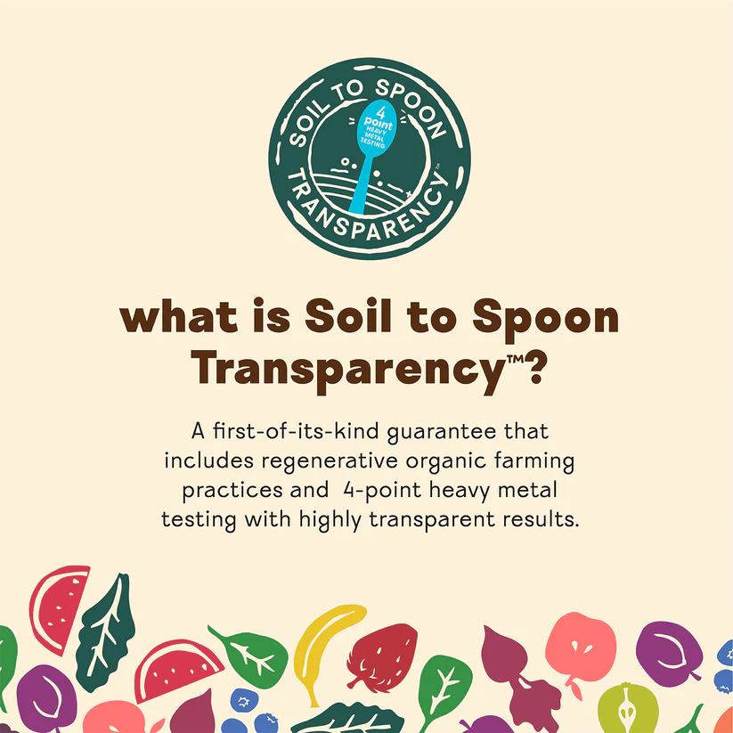 This is our unwavering commitment to safer, purer food for your baby. Soil to Spoon Transparency™ is a first-of-its-kind guarantee that includes Regenerative Organic Certified® farming and 4-point heavy metal testing with highly transparent results.