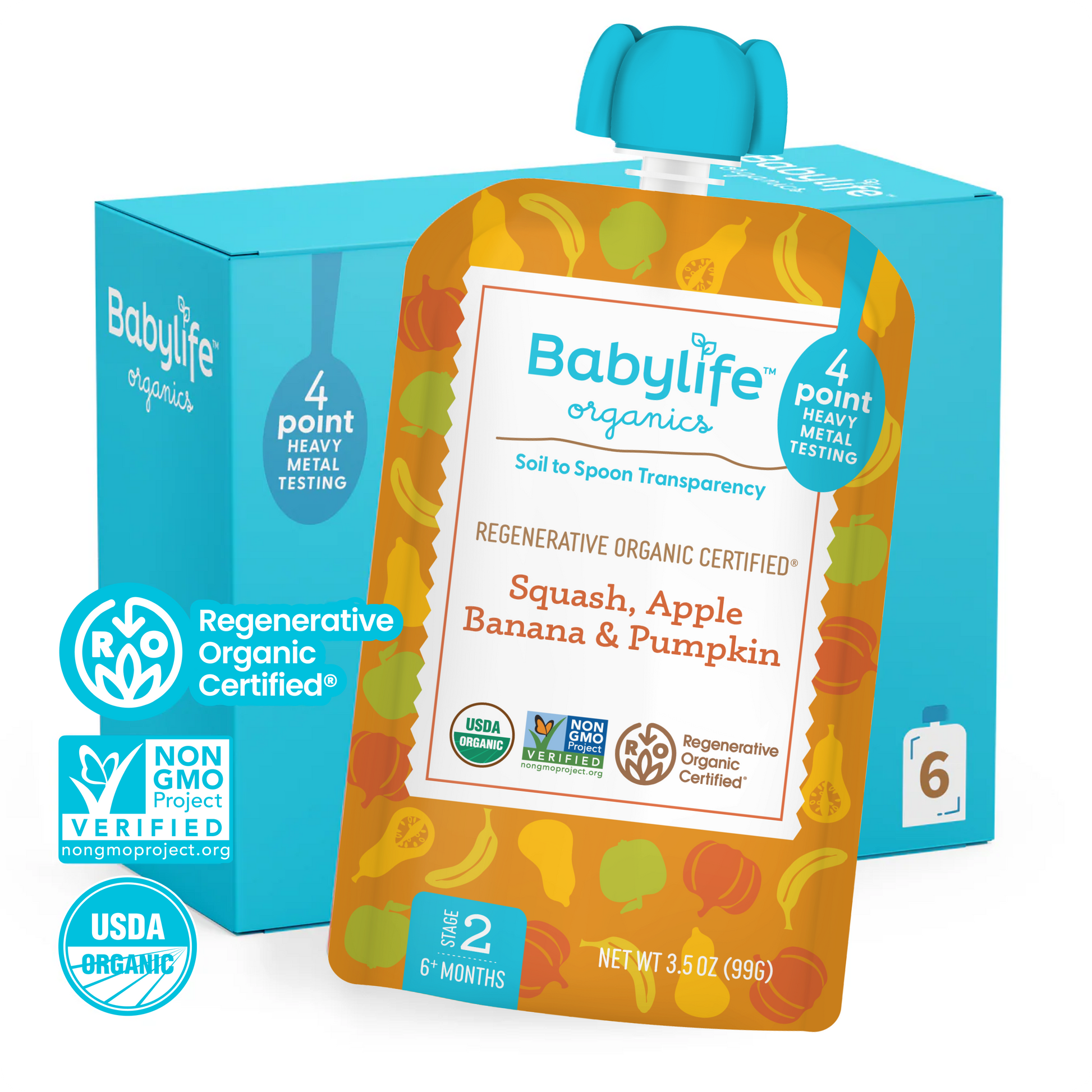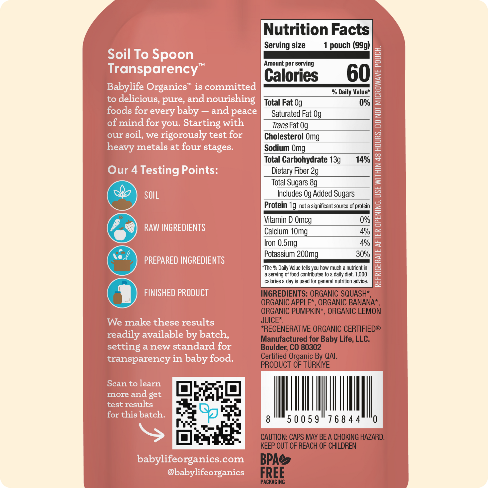 Basically, cozy vibes in a pouch. Squash and pumpkin bring the comfort, apple and banana keep it familiar. Easy texture, mellow flavor, and zero drama at mealtime.